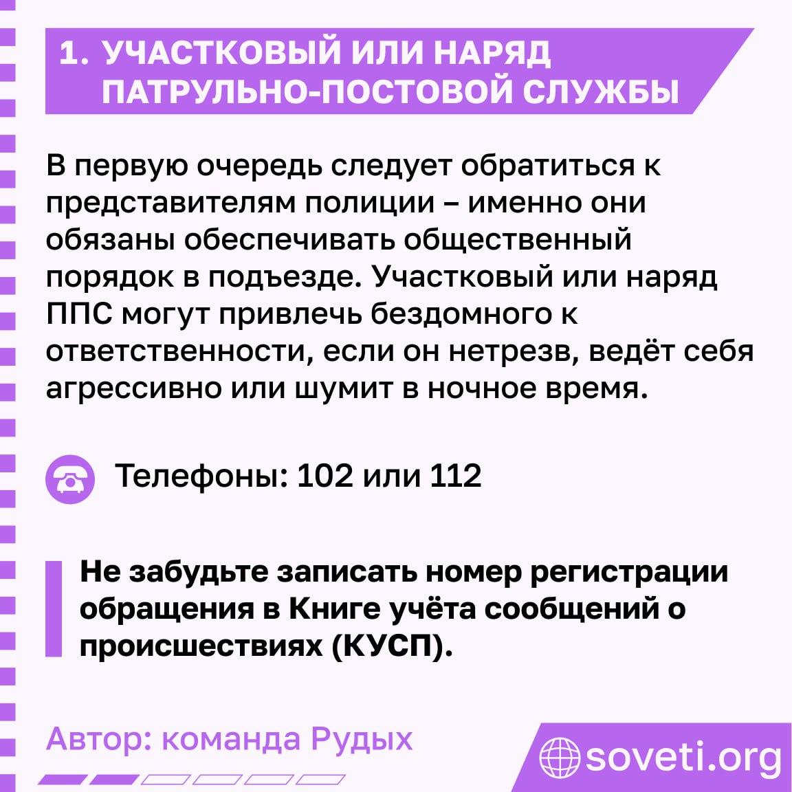 Обеспечивать безопасность граждан и общественный порядок обязаны представители полиции, поэтому в случае обнаружения бездомных в подъезде обращаться следует именно к ним по телефонам: 02 или 102. Обязательно запишите номер регистрации обращения в Книге учёта сообщений о происшествиях (КУСП)!