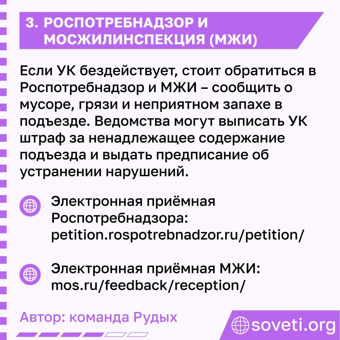 Если в подъезде появляются мусор, грязь и неприятный запах, а управляющая компания бездействует, нужно подать жалобу на антисанитарию в подъезде в Роспотребнадзор и Жилинспекцию. Если ведомства выявят недобросовестную уборку подъездов, управляющая компания получит штраф и предписание об устранении нарушений.
