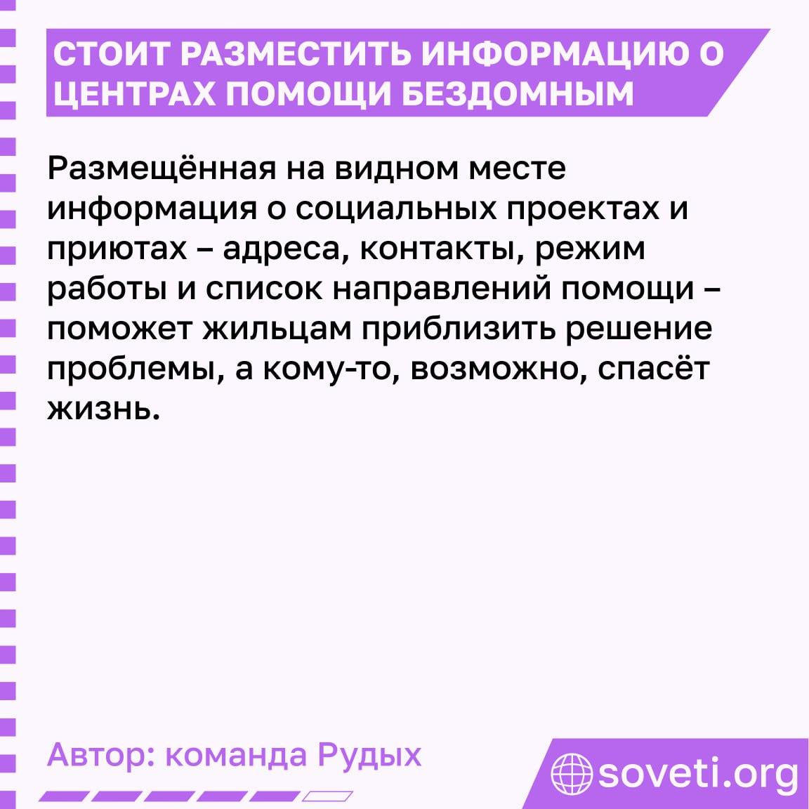 Размещённая на видном месте информация о социальных проектах и приютах – адреса, контакты, режим работы и список направлений помощи – поможет жильцам приблизить решение проблемы, а кому-то, возможно, спасёт жизнь.