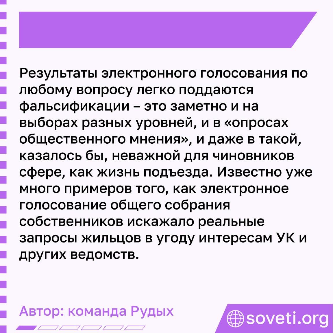 Москвичи лучше многих усвоили урок: электронное голосование, будь то федеральные или местные выборы, опросы на правительственных порталах или любая другая попытка выяснить мнение горожан дистанционно, до добра не доводит. Зачастую результаты такого голосования отражают не реальное положение дел, а пожелания власть имущих – в выборные органы вместо известных активистов попадают лояльные кандидаты, вместо инициатив, исходящих от самих горожан, проводятся в жизнь непопулярные проекты чиновников, и даже в вопросах, касающихся дома или подъезда, не учитывается мнение жильцов.