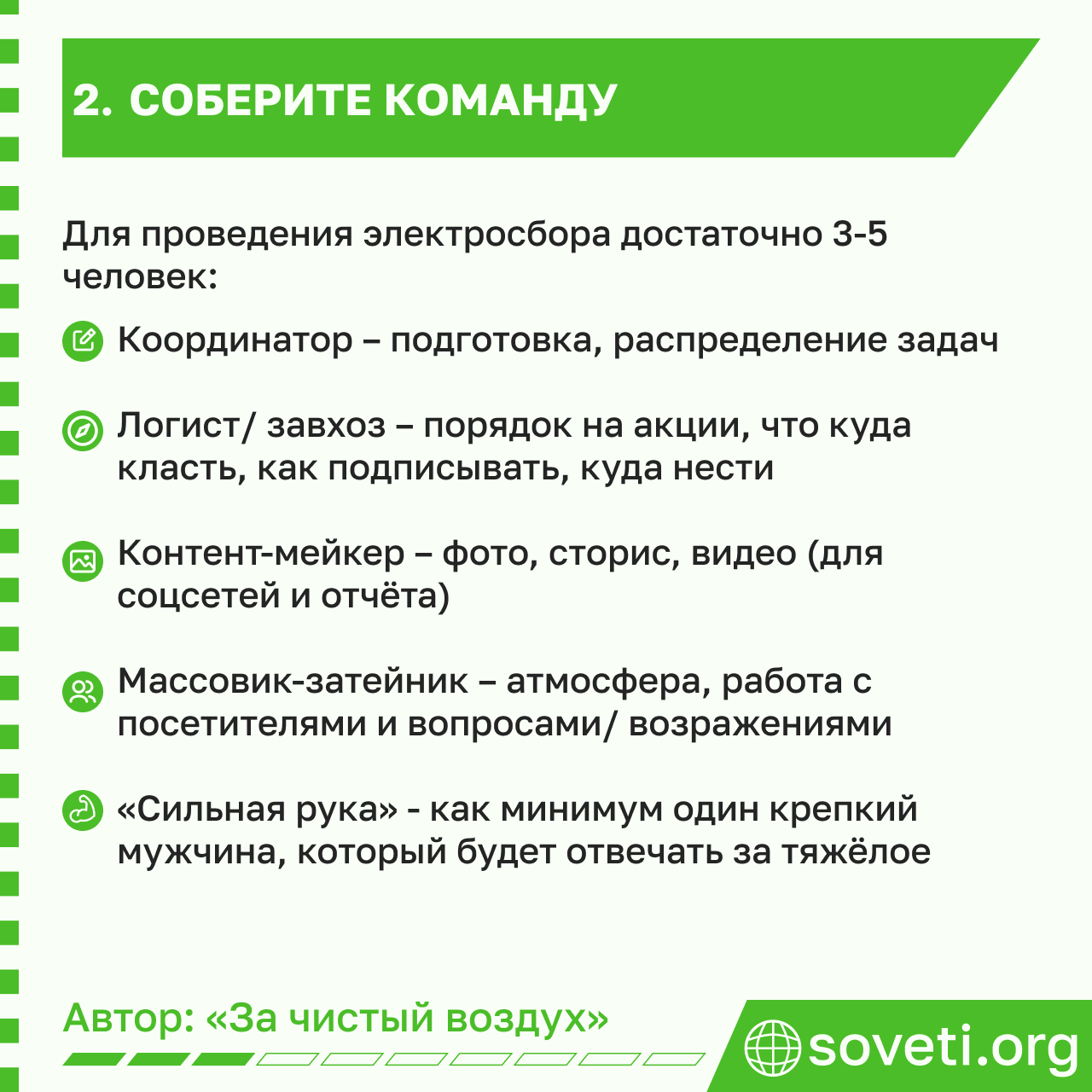 - Логист/ завхоз – следит за порядком на акции, знает, в какой мешок что класть, как подписывать и куда нести;