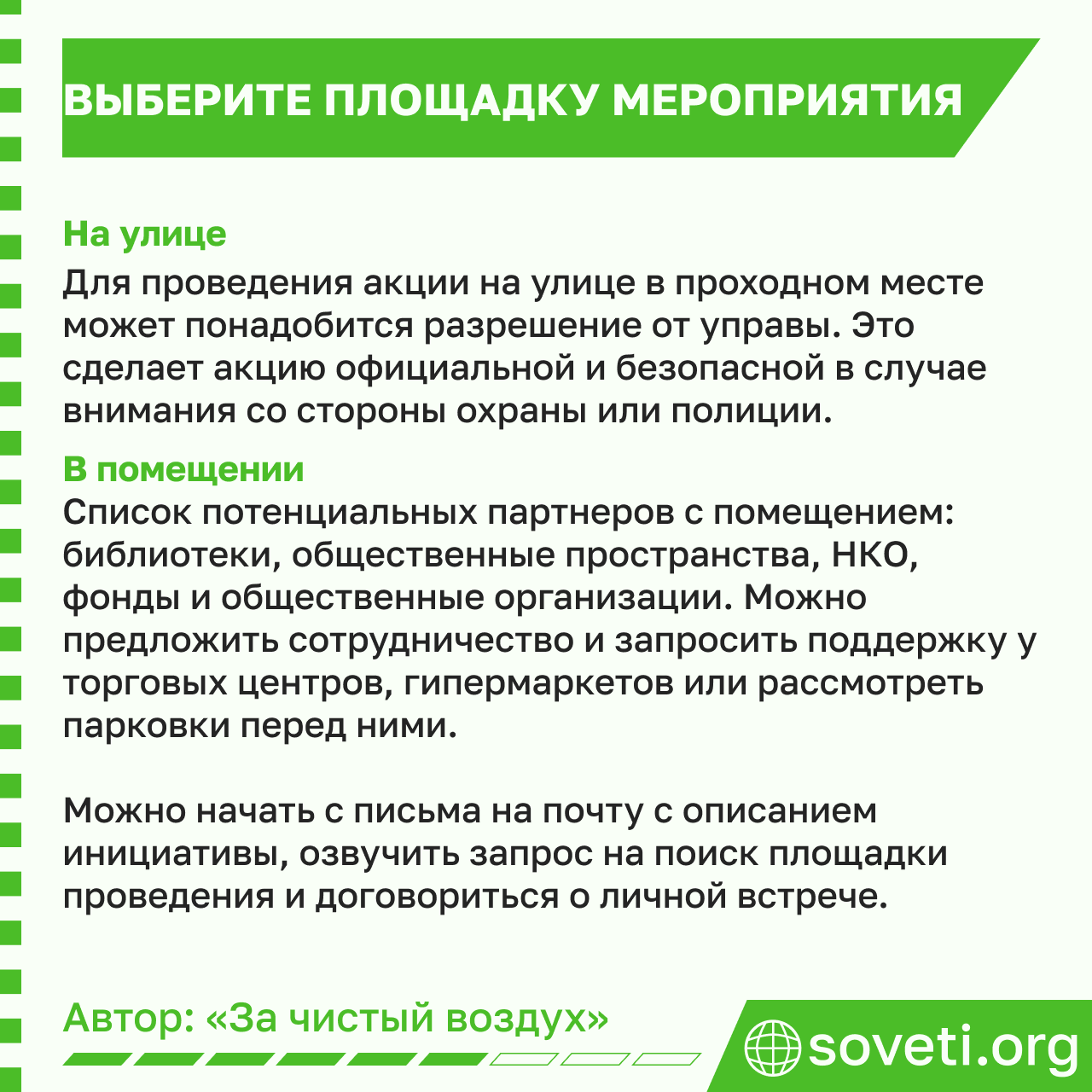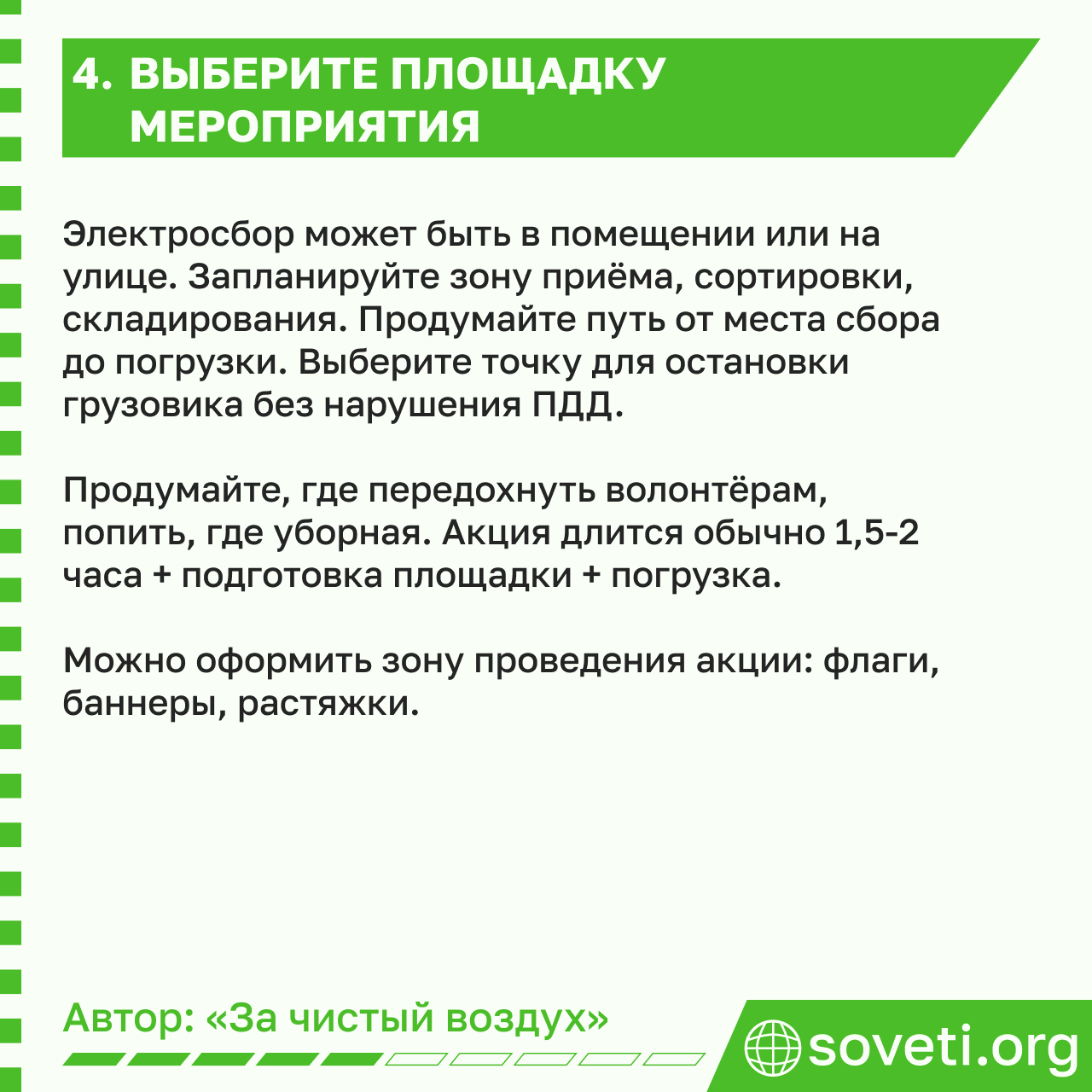 Продумайте комфорт волонтёров: где можно передохнуть, наполнить бутылочку водой, где ближайшая уборная. Акция длится обычно 1,5-2 часа + подготовка площадки + погрузка.