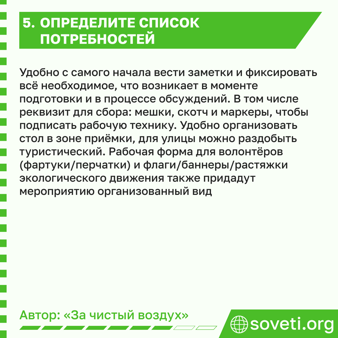 Удобно с самого начала вести заметки и фиксировать всё необходимое, что возникает в моменте подготовки и в процессе обсуждений. В том числе реквизит для сбора: мешки, скотч и маркеры, чтобы подписать рабочую технику. Удобно организовать стол в зоне приёмки, для улицы можно раздобыть туристический. Рабочая форма для волонтёров (фартуки/перчатки) и флаги/баннеры/растяжки экологического движения также придадут мероприятию организованный вид.