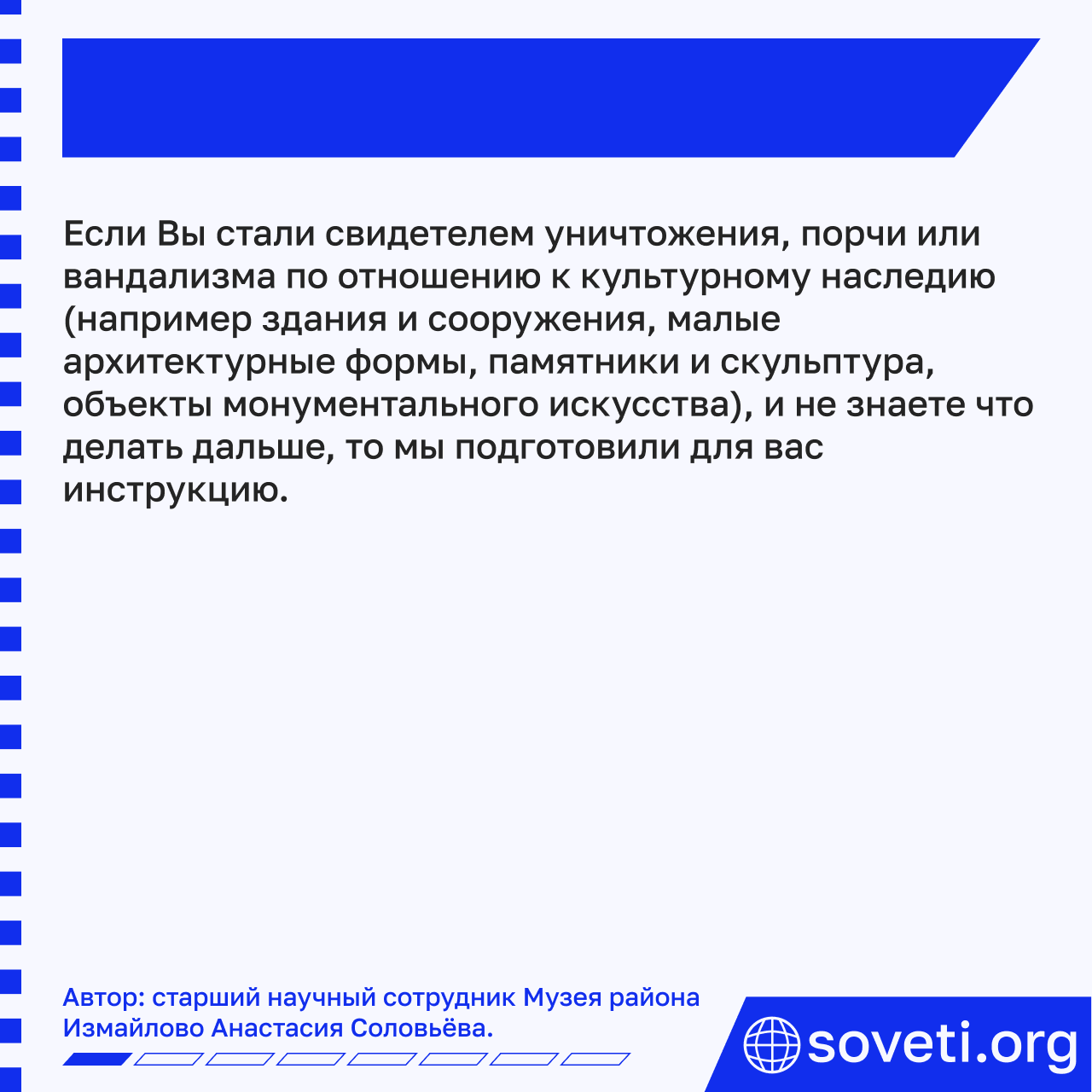 Если Вы стали свидетелем уничтожения, порчи, вандализма по отношению к культурному наследию, к которому могут относиться здания/сооружения, малые архитектурные формы, памятники/скульптура, объекты монументального искусства, то: