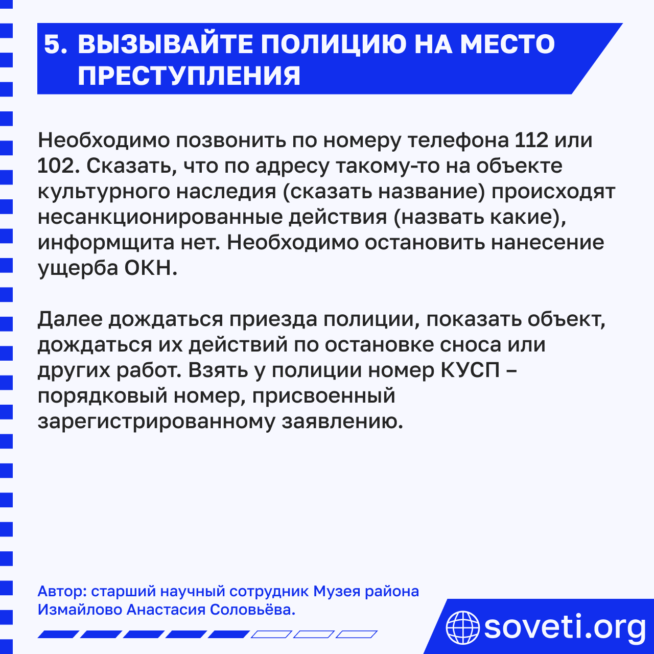 5. Если уничтожается объект, внесённый в государственный реестр ОКН, вызывайте полицию!