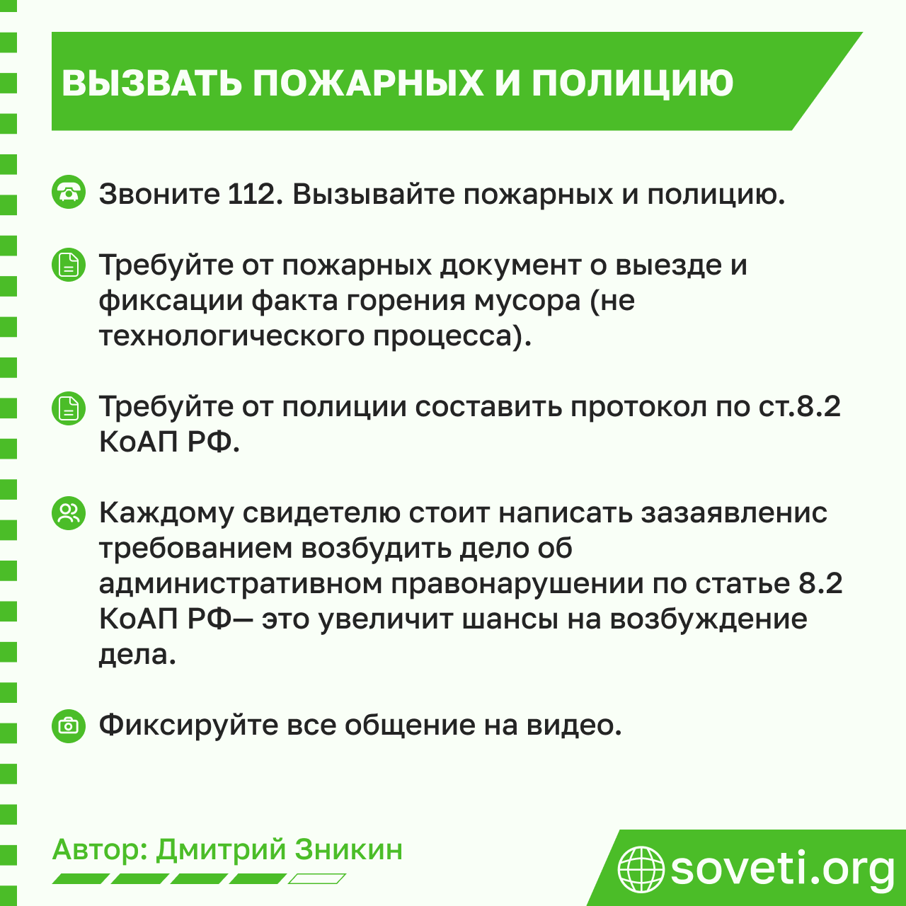 Стоит потребовать, чтобы полицейские забрали в отдел всех, кто был задействован в мусоросжигании, для дачи объяснений. Если полиция будет противиться, нужно снимать процесс на видео и говорить, что в дальнейшем оно будет отправлено во все надзорные ведомства. Чем больше инициативных жителей присутствует на месте, тем лучше.