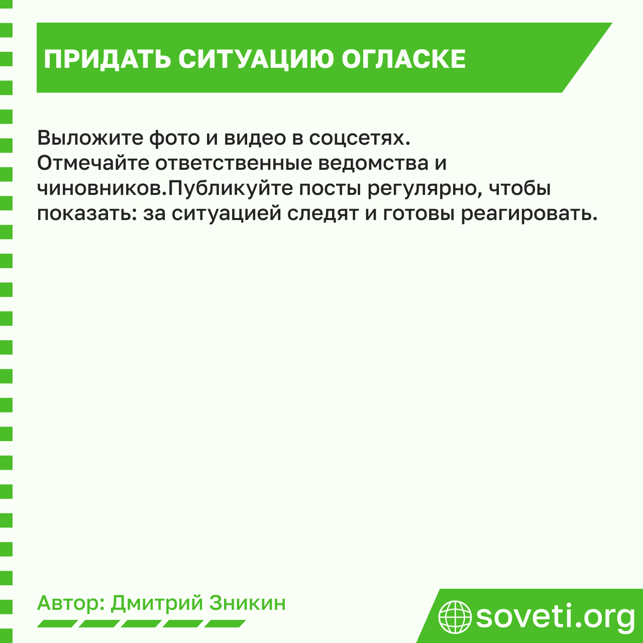 Все снятые фото и видео нужно выложить в соцсетях, отмечая в постах аккаунты всех ответственных ведомств и чиновников. Публикации лучше всего делать не однократно, а на постоянной основе – это показывает, что инициативные жители мониторят ситуацию и готовы в будущем оперативно реагировать на нарушения.