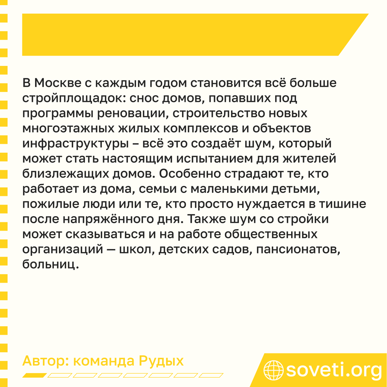 В Москве с каждым годом становится всё больше стройплощадок: снос домов, попавших под программы реновации, строительство новых многоэтажных жилых комплексов и объектов инфраструктуры – всё это создаёт шум, который может стать настоящим испытанием для жителей близлежащих домов. Если для одних это временное неудобство, то для других – серьёзная проблема, влияющая на качество жизни. Особенно страдают те, кто работает из дома, семьи с маленькими детьми, пожилые люди или те, кто просто нуждается в тишине после напряжённого дня. Также шум со стройки может сказываться и на работе общественных организаций — школ, детских садов, пансионатов, больниц.