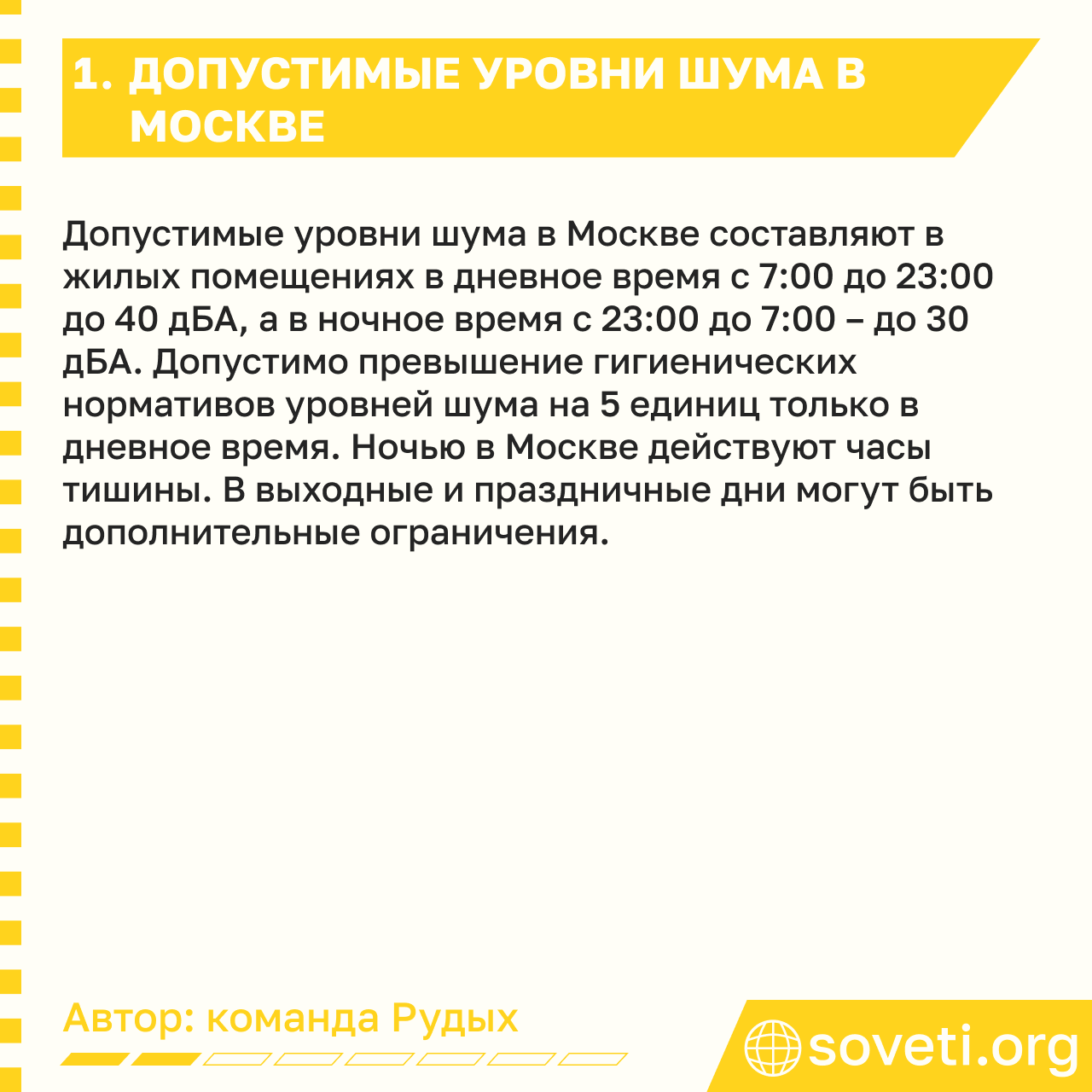 Допустимые уровни шума установлены СанПиН 1.2.3685-21 "Гигиенические нормативы и требования к обеспечению безопасности и (или) безвредности для человека факторов среды обитания". Они составляют в жилых помещениях в дневное время с 7:00 до 23:00 до 40 дБА, а в ночное время с 23:00 до 7:00 – до 30 дБА. Допустимо превышение гигиенических нормативов уровней шума на 5 единиц только в дневное время. Ночью в Москве действуют часы тишины. В выходные и праздничные дни могут быть дополнительные ограничения.