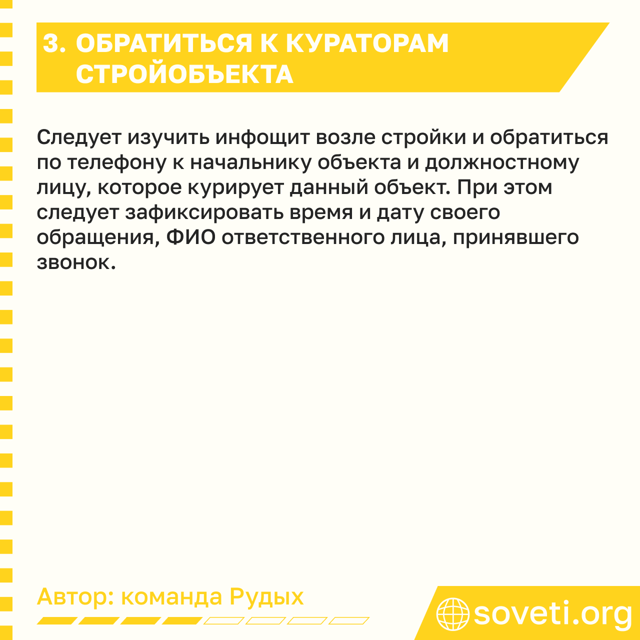 Изучить информационный щит возле стройки и обратиться по телефону к начальнику объекта и должностному лицу, которое курирует данный объект. Их контакты должны быть указаны на информационном щите.
