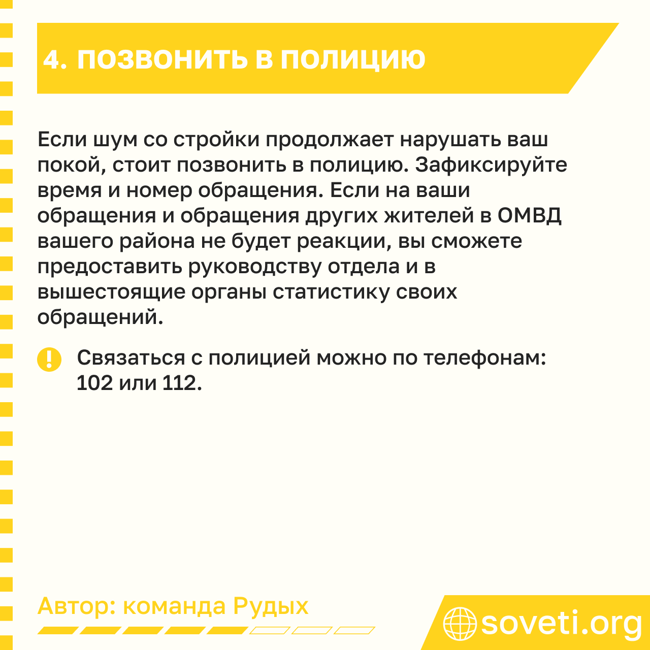 Если шум со стройки продолжает нарушать ваш покой, стоит позвонить в полицию. Зафиксируйте время и номер обращения. Если на ваши обращения и обращения других жителей в ОМВД не будет реакции, вы сможете предоставить руководству отдела и в вышестоящие органы статистику своих обращений.