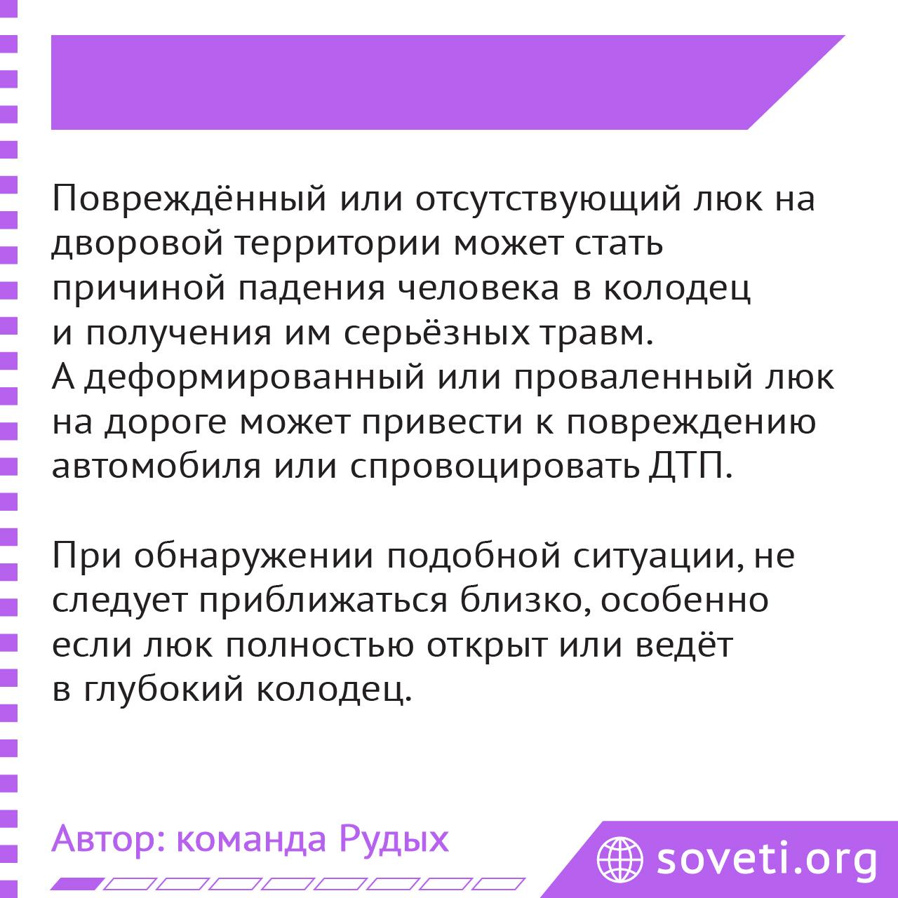 Повреждённый или отсутствующий люк на дворовой территории может стать причиной падения человека в колодец и получения им серьёзных травм. А деформированный или проваленный люк на дороге может привести к повреждению автомобиля или спровоцировать дорожно-транспортное происшествие (ДТП).