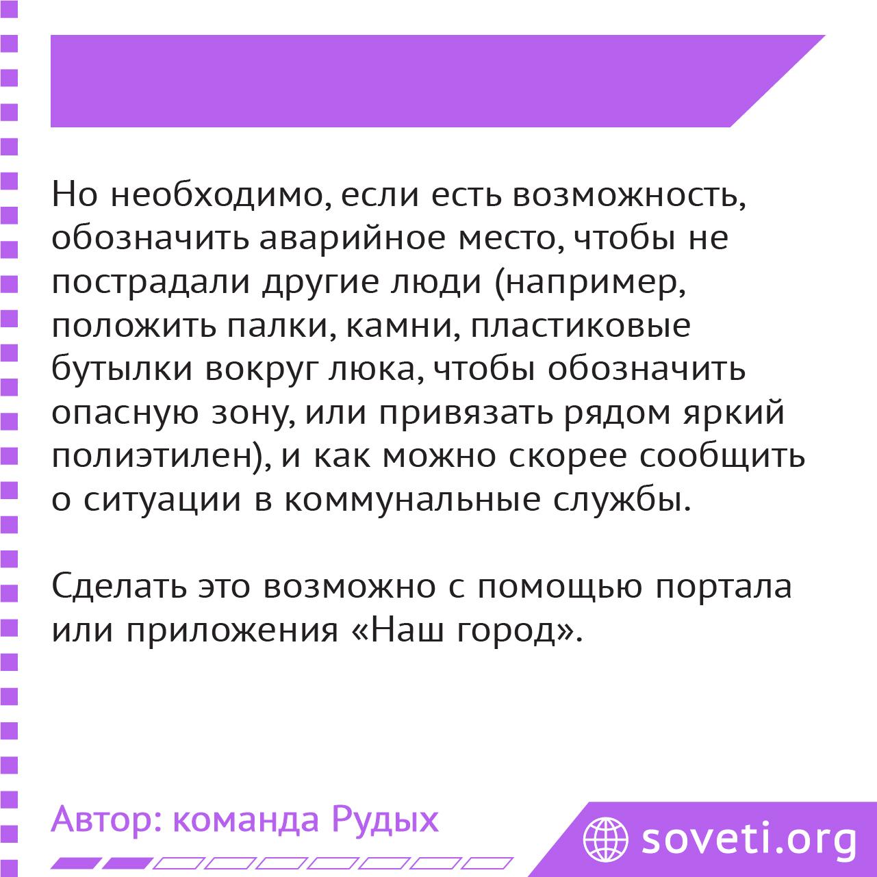 Но необходимо, если есть возможность, обозначить аварийное место, чтобы не пострадали другие люди (например, положить палки, камни, пластиковые бутылки вокруг люка, чтобы обозначить опасную зону, или привязать рядом яркий полиэтилен), и как можно скорее сообщить о ситуации в коммунальные службы.